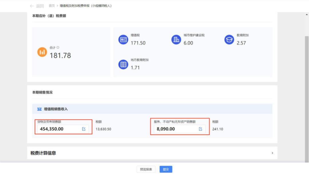 进入填表模式后,您需要按照一般纳税人申报表填表规则填写申报表数据,可点击左侧栏次查看修改附表,本期需要缴纳的税费数据会显示在页面的左下角。