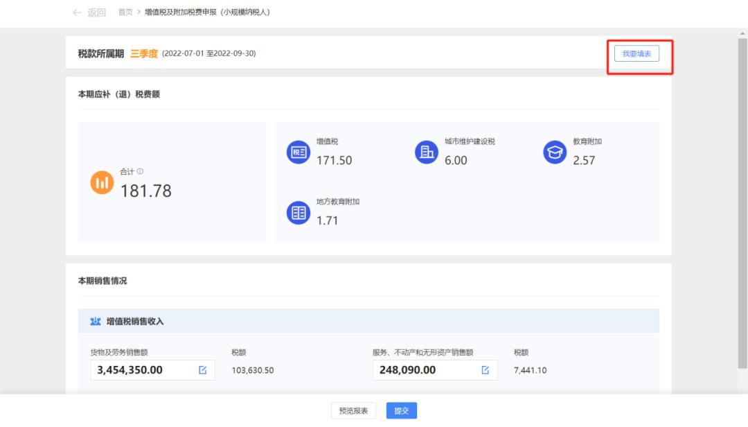 (3)纳税人如需进入申报表填表界面,点击“我要填表”,进入填表式申报模式,填写完成确认后点击【提交】。