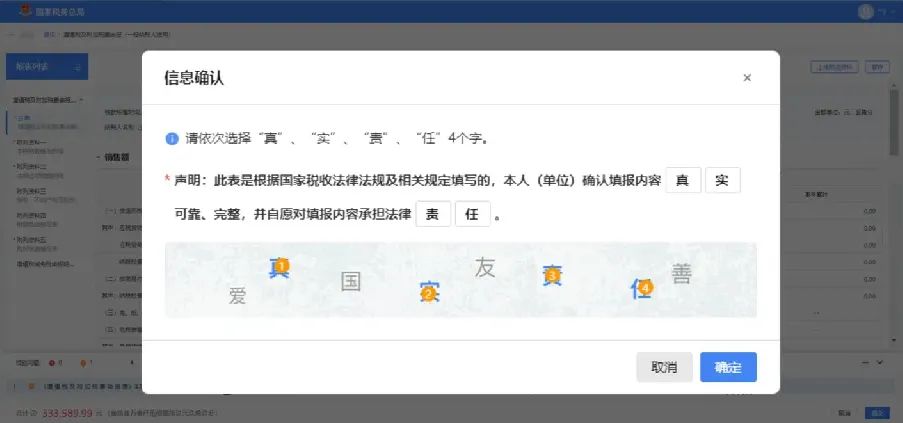 确认数据无误后,点击【提交】后,需要对本次申报结果进行确认声明,您根据提示补全声明信息后,点击【确定】即可提交申报。