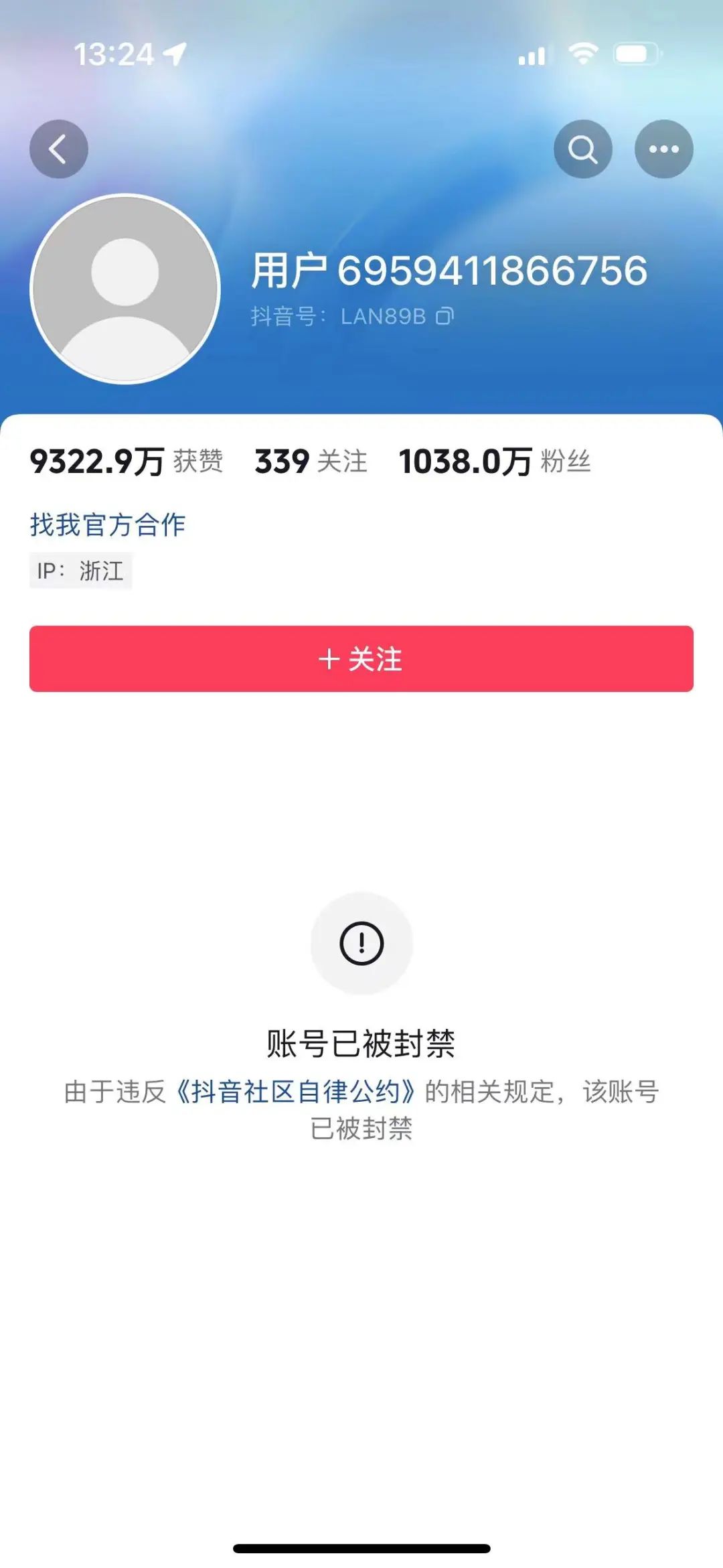 目前,“大蓝”原账号主页显示:“由于违反《抖音社区自律公约》的相关规定,该账号已被封禁。