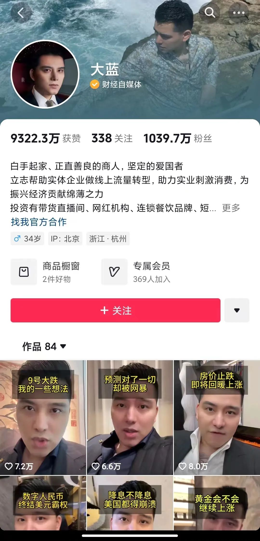 10月11日,读秒财经搜索发现,千万粉财经博主“大蓝”被抖音平台封号。