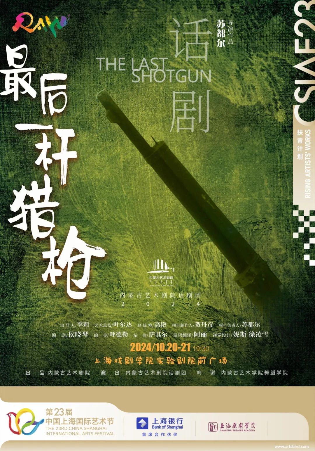 本届“扶持青年艺术家计划”委约作品,由蒙古族青年艺术家苏都尔创作的蒙古语原创话剧《最后一杆猎枪》,讲述了草原上人与狼生存空间争夺、较量的故事:有血腥残酷的、有勇猛悲壮的、也有温情脉脉的。该剧采用开放式舞台,表现形式采用话剧+蒙古族舞蹈+蒙古族音乐现场演奏,带着观众走入辽阔草原,旨在唤起现代人对人与自然、人与动物关系的深刻反思。