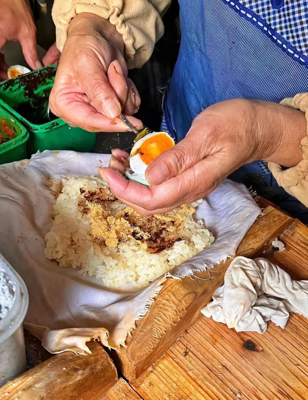 最早粢饭团里一般就加油条和白糖,后来花样多了,就会放一些咸菜、咸蛋黄肉松、火腿肠等等。