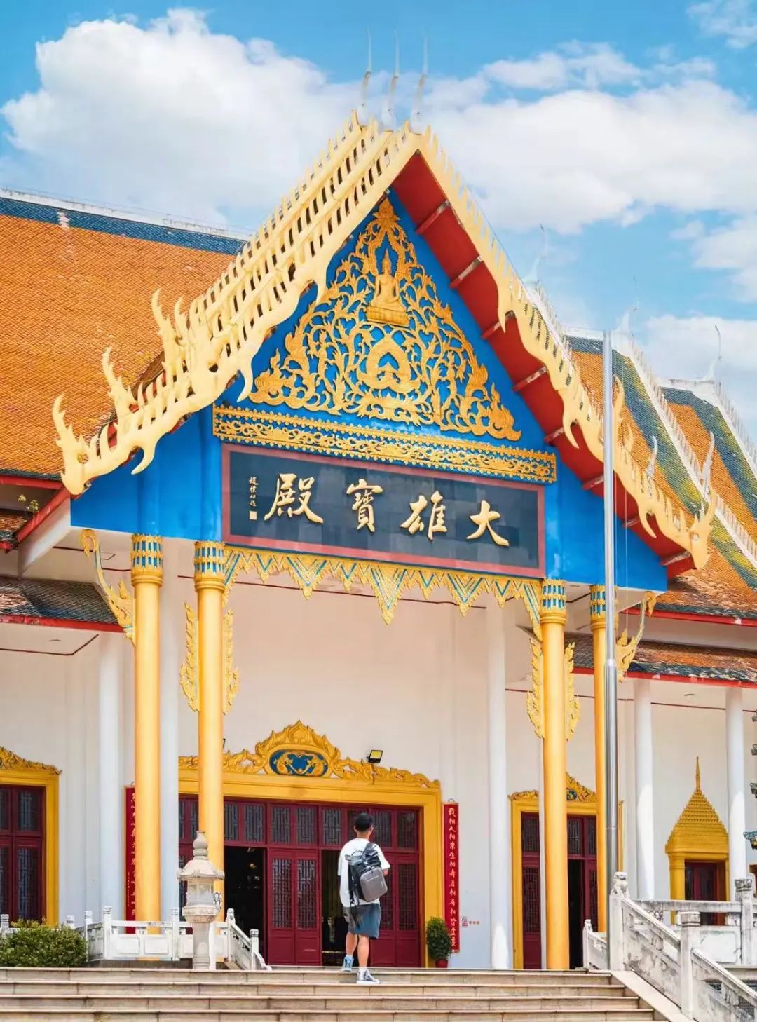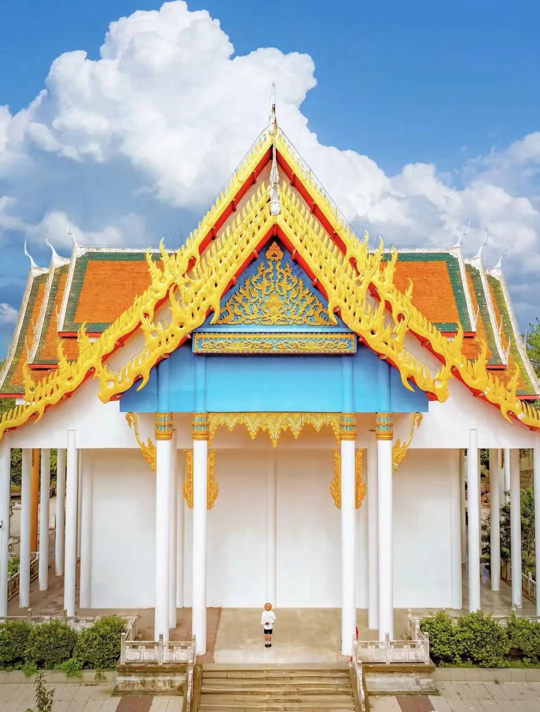 金色的飞檐翘角,配上蓝色门匾和白色廊柱,异域风情超级浓郁,让人仿佛置身于清迈的寺庙之中。