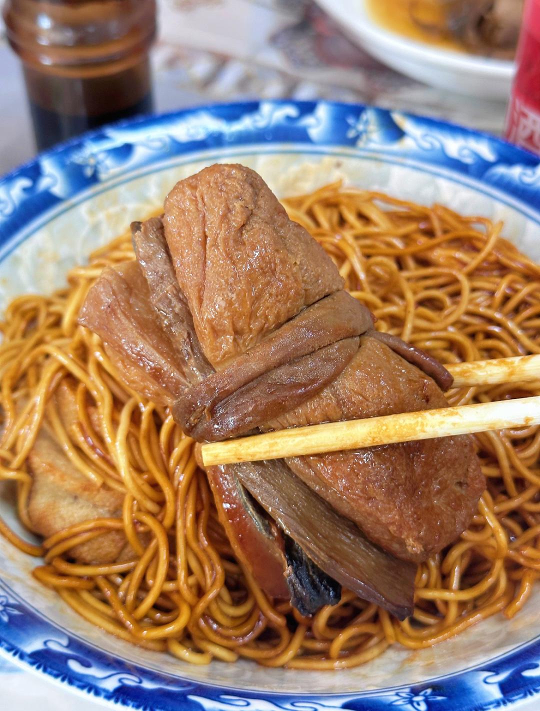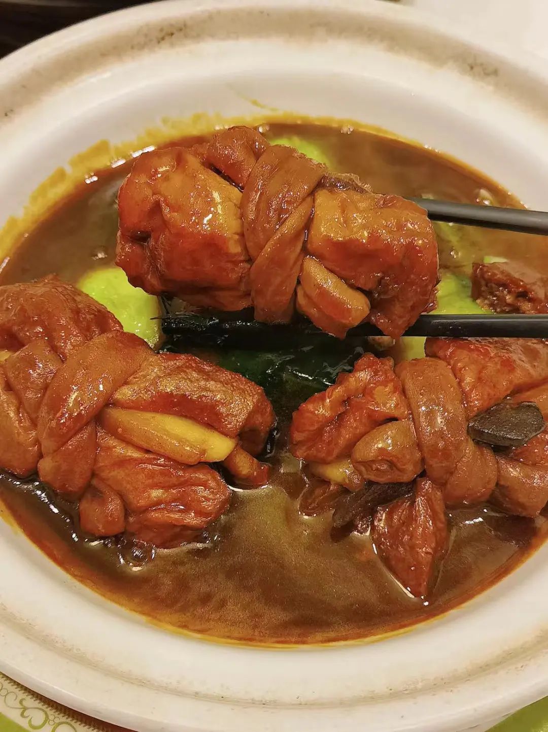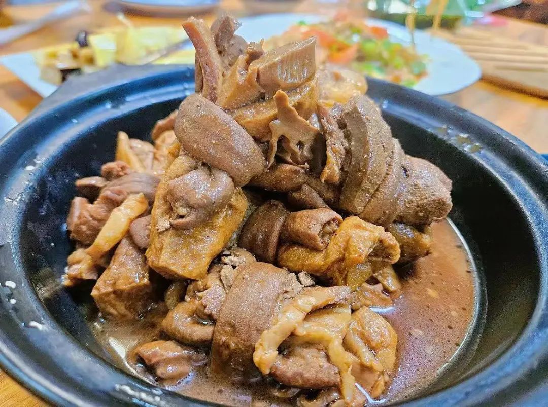 两块油豆腐,中间裹着猪肉、猪肝、笋干、再用猪小肠捆扎起来,加入10多种佐料,大火烧制,最后收干卤汁,入口鲜香四溢,堪称下饭神器。