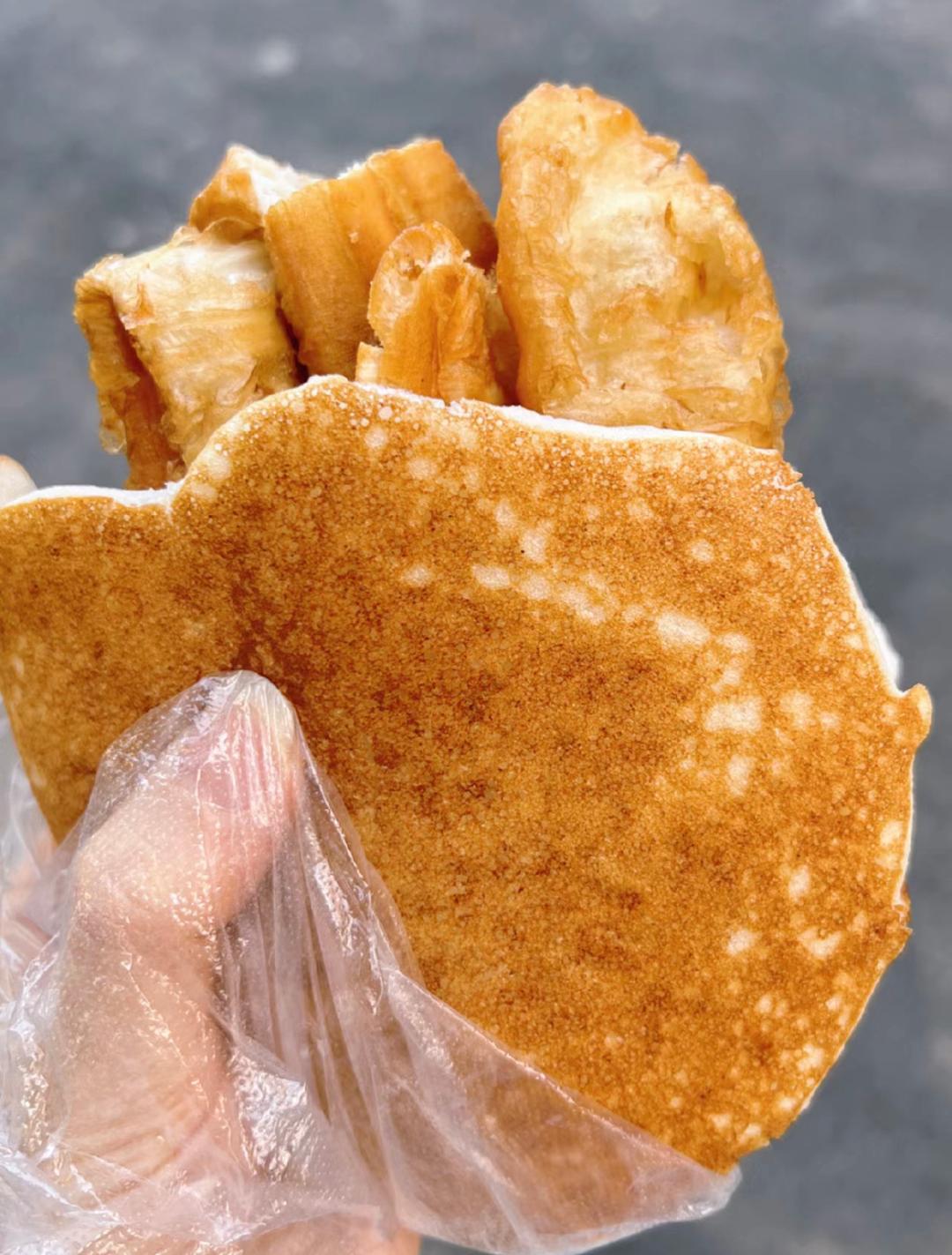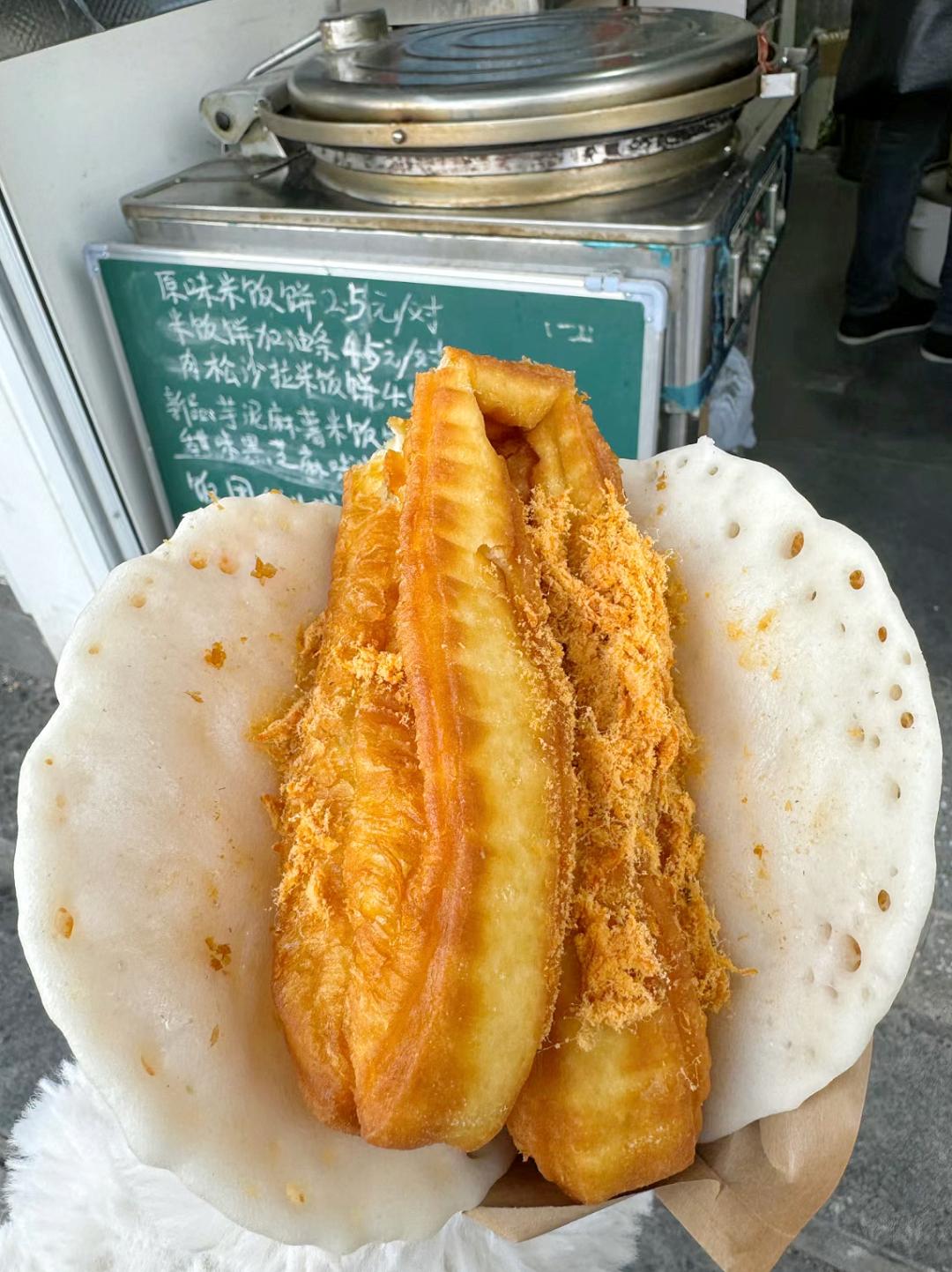 加了酒酿来煎的米饭饼又糯又香,里面的油条还嘎嘣脆,这碳水+碳水的双重组合,真的让碳水爱好者们直接尖叫。(可以单点米饭饼,可以加油条)