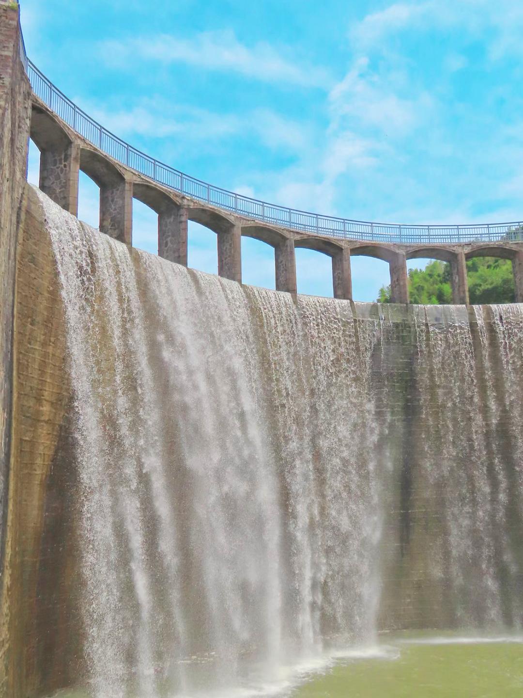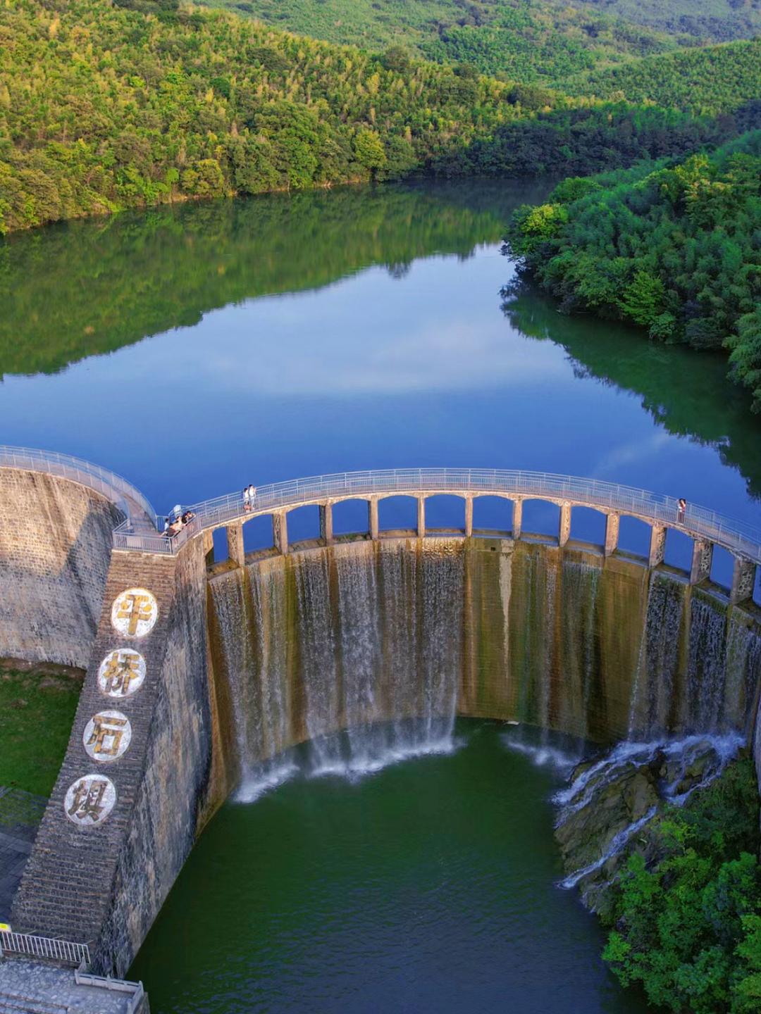 处于两山之间的平桥石坝,高达30余米、长118米,每年雨季时,山水浩荡涌来,真有种“飞流直下三千尺”的磅礴气势了。