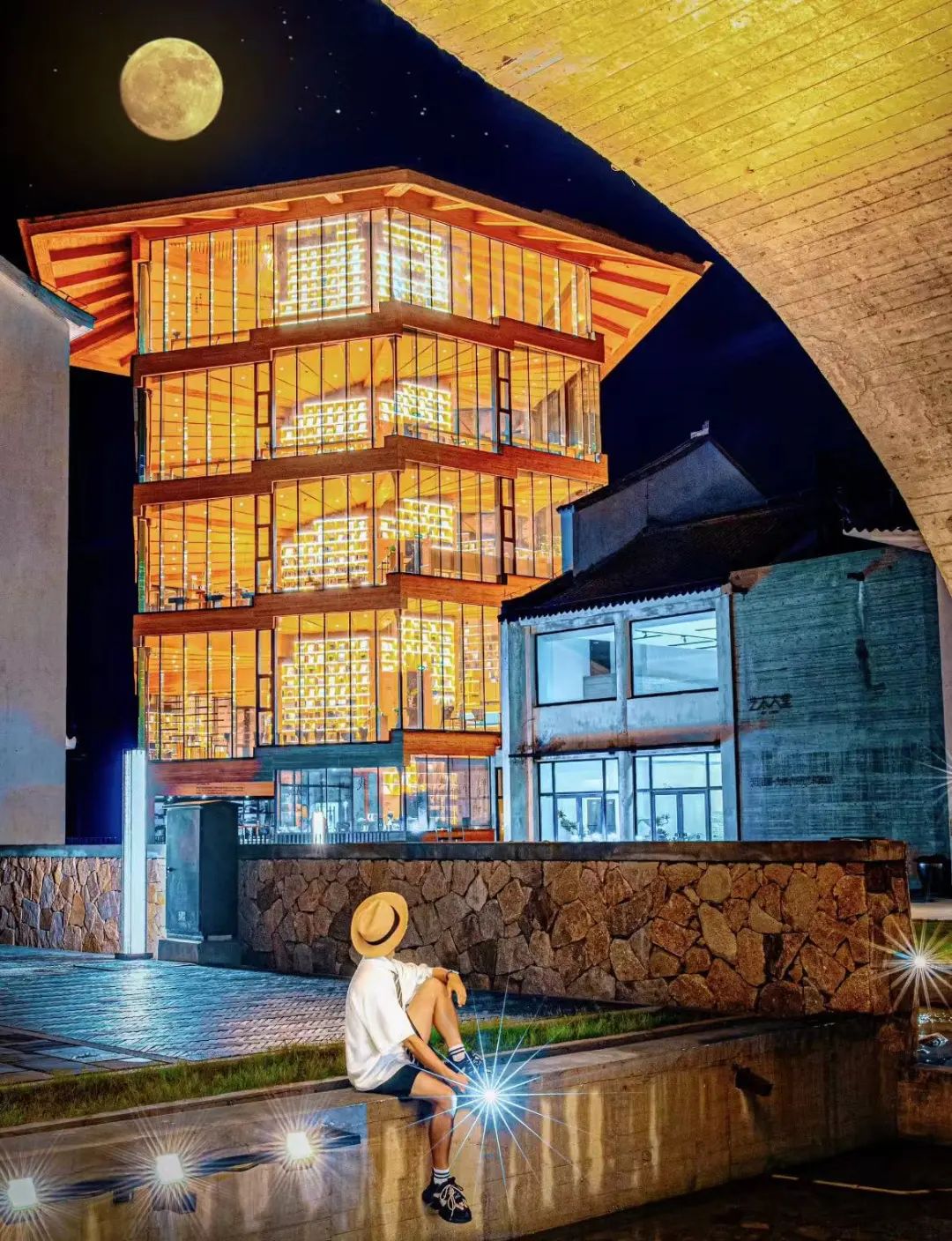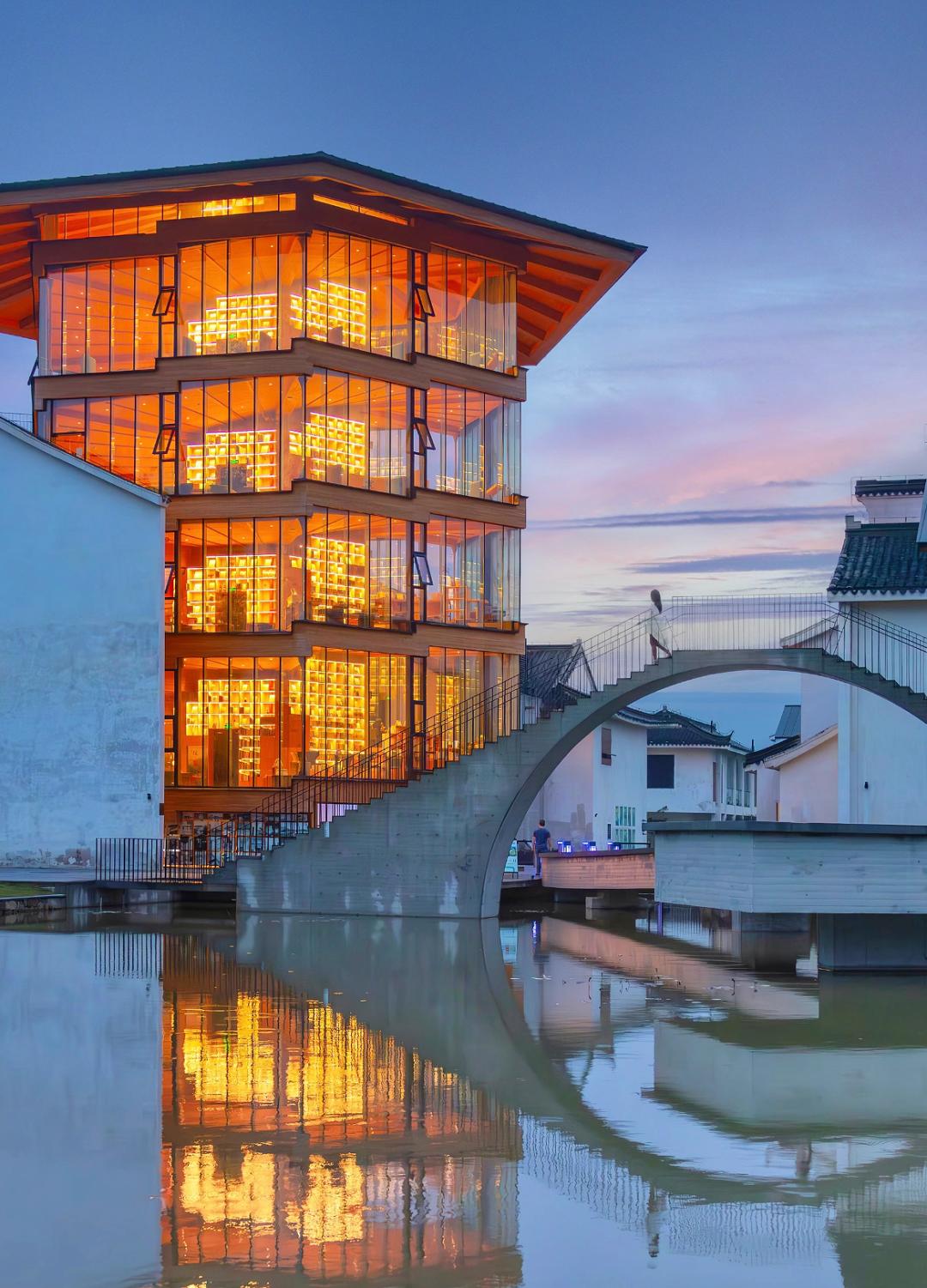 亮灯之后,天目书塔就成了“梦中的图书馆”,再加上悬桥、旋转楼梯,传统徽派与现代建筑交相辉映,实在是太赞了。