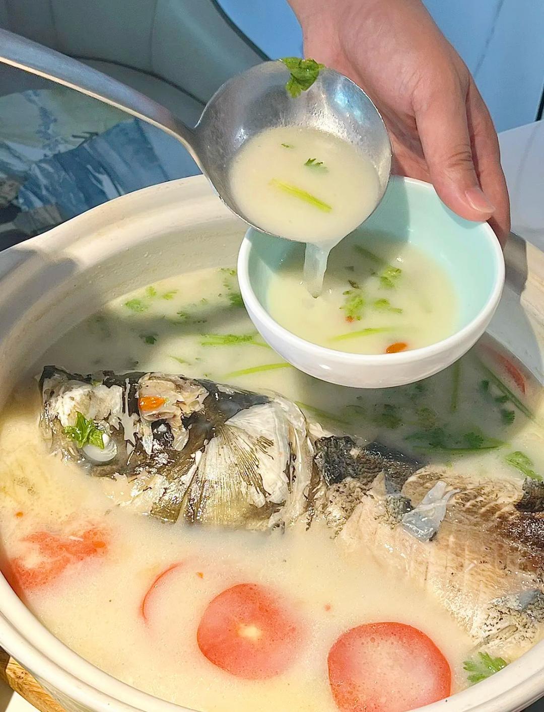 上桌时,鱼汤奶白鲜美,再撒上香菜和白胡椒粉,更是提味,鱼头也丝毫没有腥味,入口即化,连喝四碗都不够。