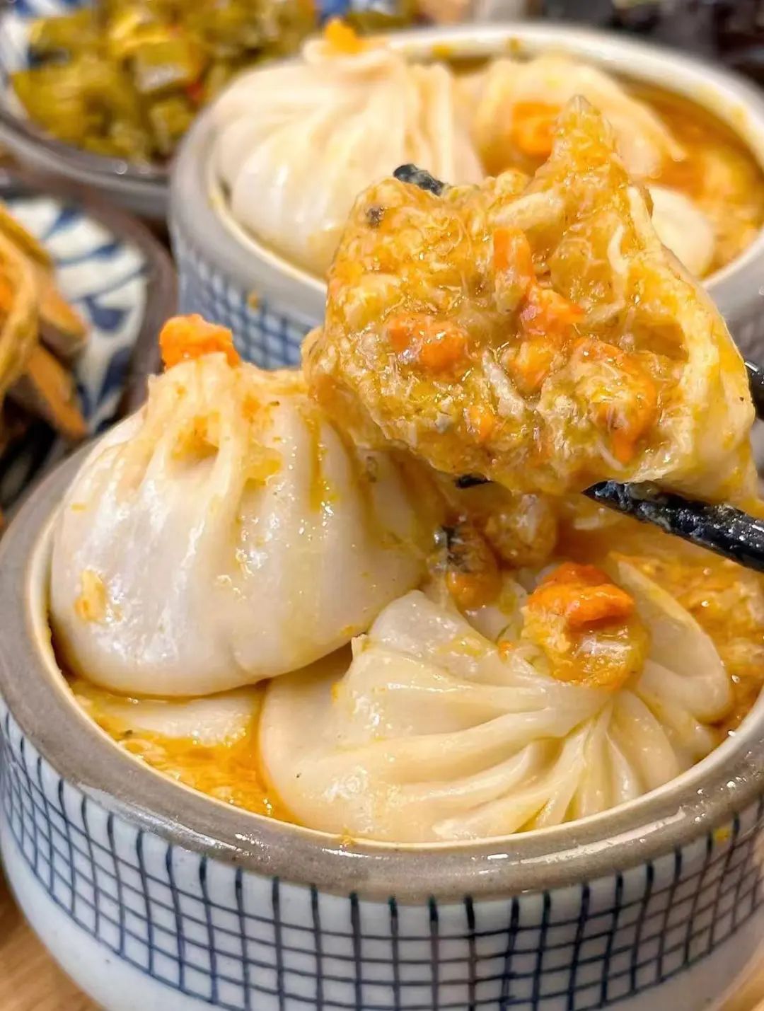 一颗颗饱满的蟹黄汤包,轻轻提起,皮薄如纸,咬开后,鲜美的蟹黄汤汁瞬间涌出,鲜味十足。