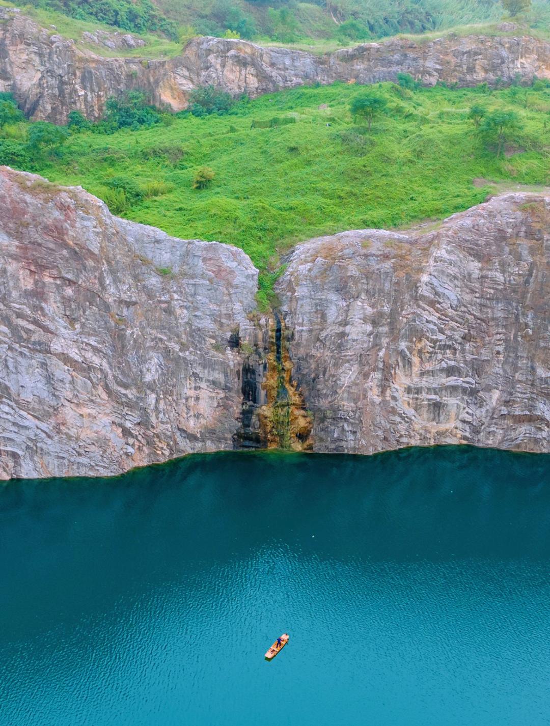 而且整个矿坑四周都有着如同白崖似的陡峭崖壁,配上宝石蓝的湖面,视觉冲击力太强了。