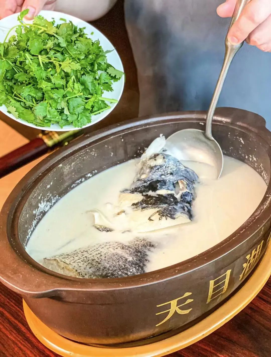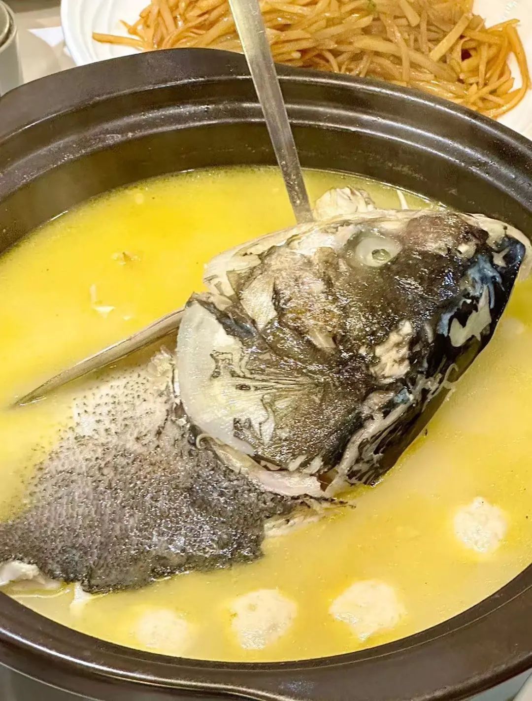 首先,鱼是用的是生长在天目湖里的鲜鱼,鱼头超大,煮之前,还得先用油锅煎黄,再放入砂锅里,加料酒、大葱、生姜等,用文火煨数小时。