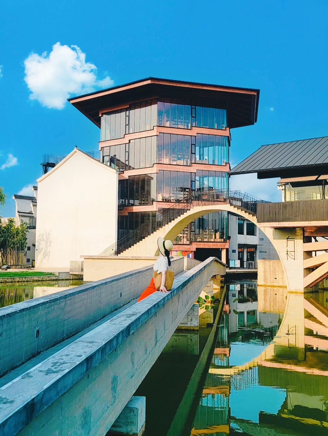 很难想象,如此有艺术感的建筑,曾是一片烂尾楼,修缮时只保留了徽派建筑山墙、屋顶和青瓦,然后加入现代木构空间,再由六座廊桥串联而起。