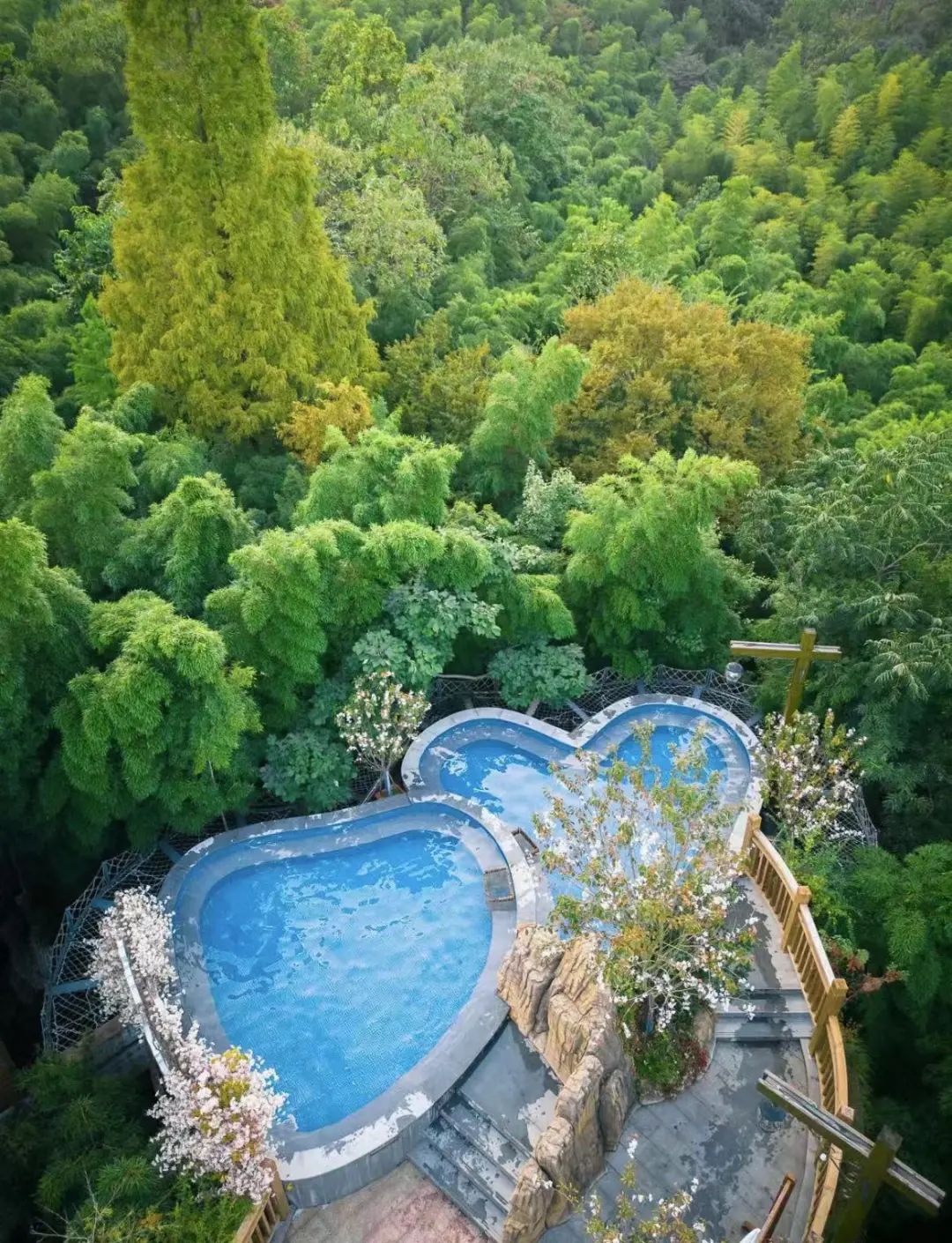离南山竹海很近的「御水温泉」,地处山林间,自然景观绝美,一边享受温暖的泉水,一边远眺万亩竹海。