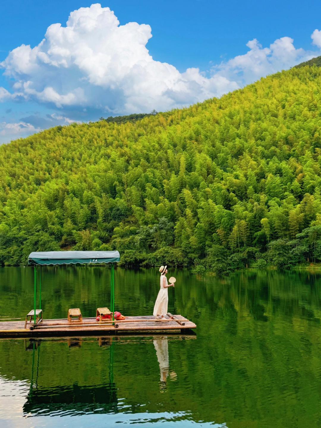 在这儿还可以乘着竹筏,泛舟而上,漫游静湖,看竹林成海、碧波连云的自然风光。