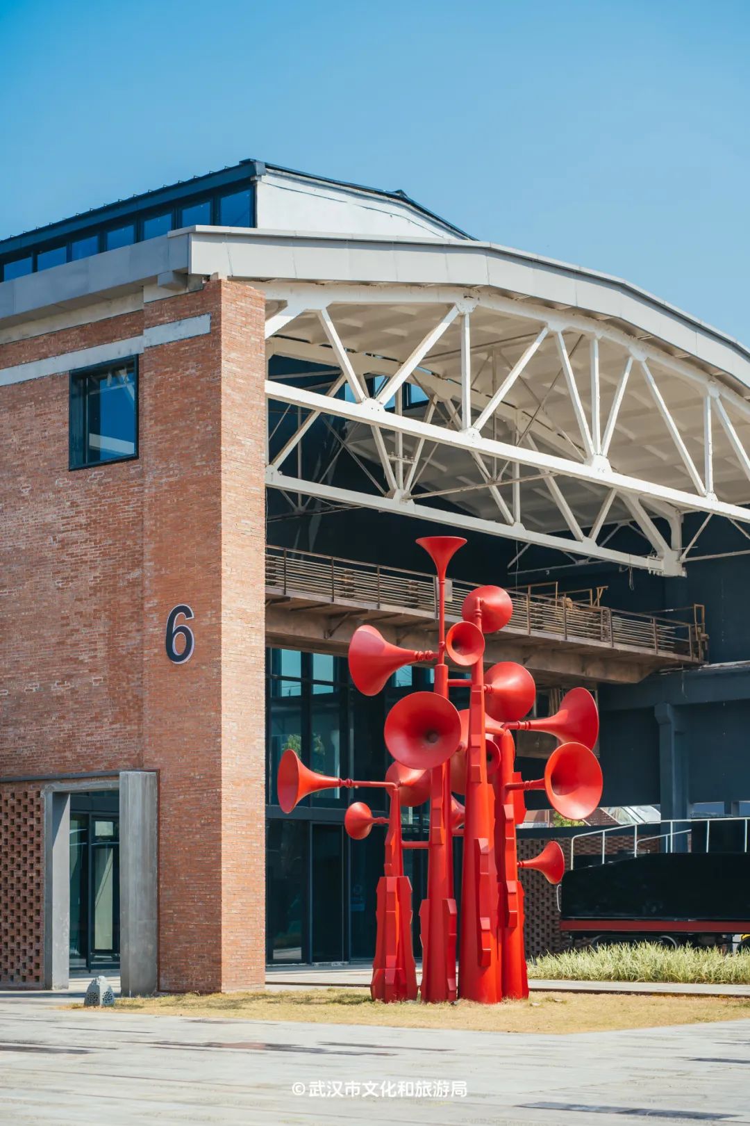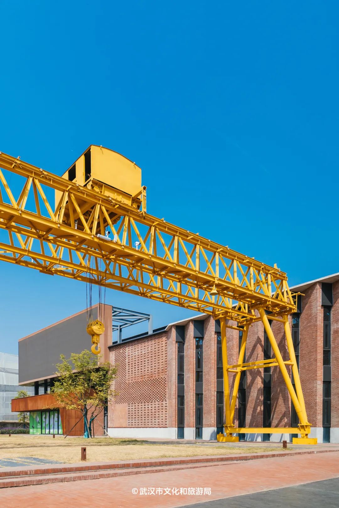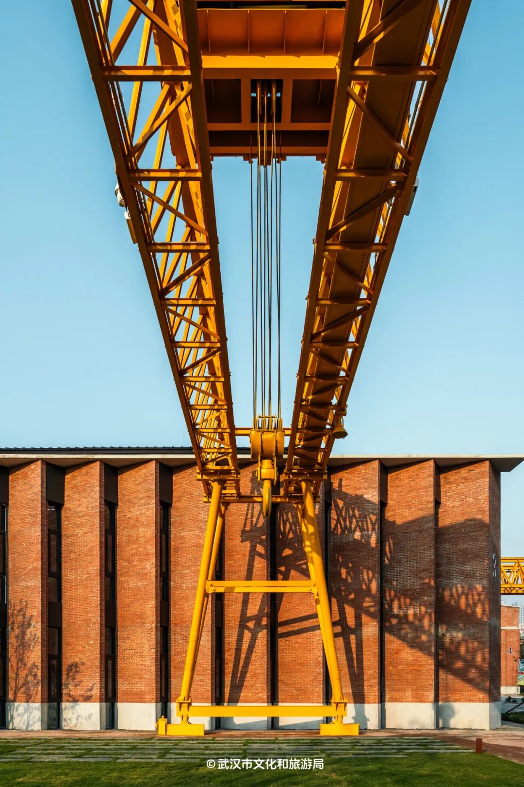 公园的另一头,是从前武九铁路北环线机修车间段的厂房,如今翻新过后,外立面的红色砖墙工业风拉满,超硬核。更硬核的是厂房外高大的龙门吊,几十年前,机修车间的工人们就是在这里,对来往的火车进行检修。今天,在光影交错下,这里又成为了超绝的打卡点。