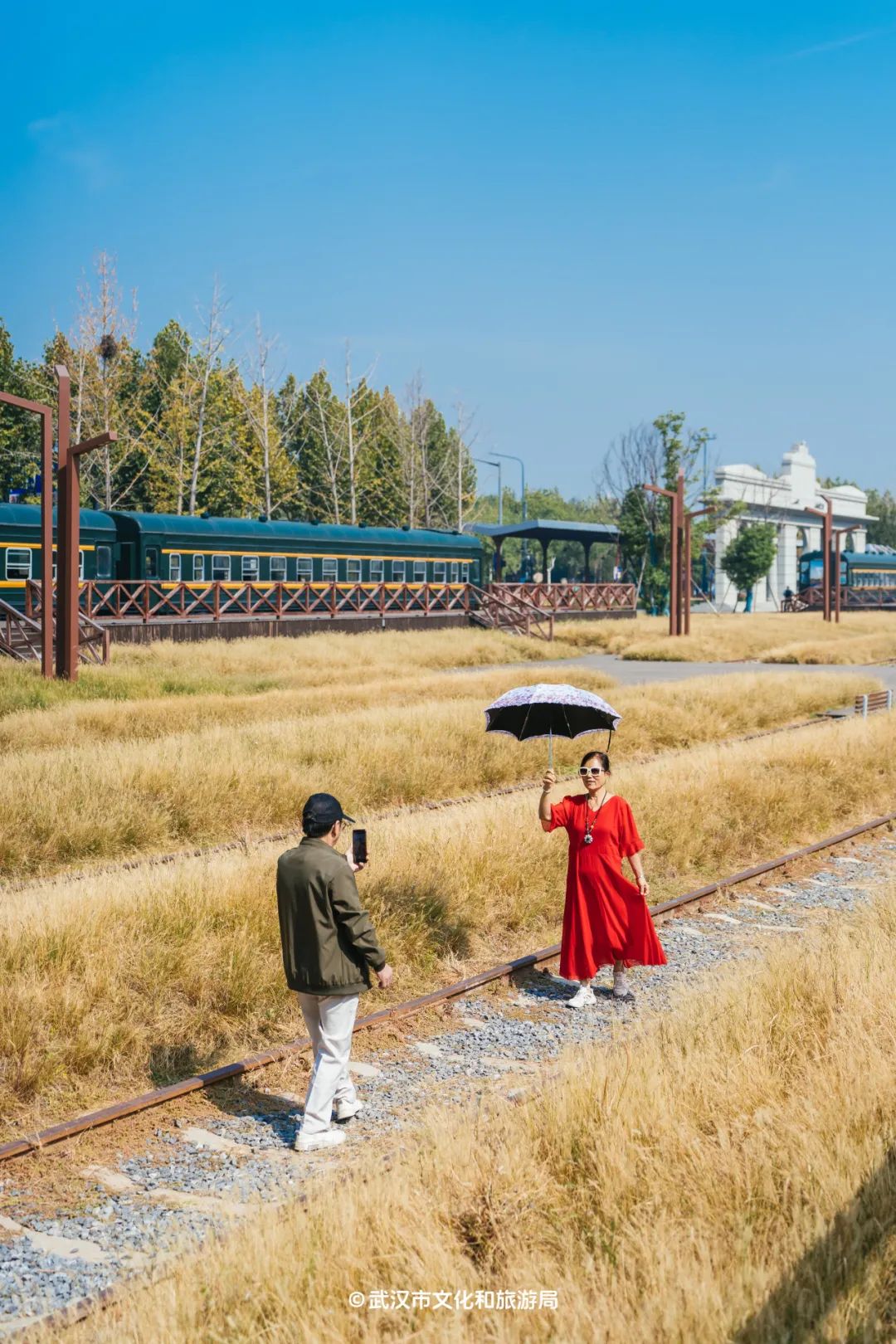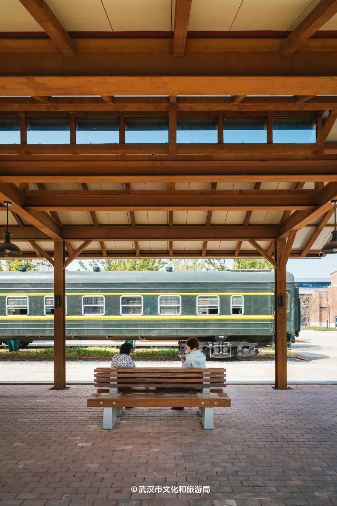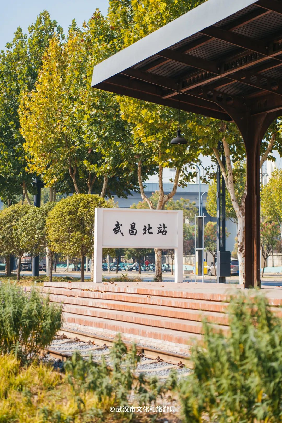 喜欢复古风的朋友,一定要去草海旁边的月台瞧瞧。它仿照上世纪的火车站台风格设计,后面的车站牌坊,则是按照四美塘文化公园的前身——徐家棚站的模样复刻而来,边上一块写着“武昌北站”的站牌,走在临江大道上就能远远望见。坐在月台的长椅上,你仿佛能看见从前的人们穿着中山装、拎着皮箱等火车的样子。
