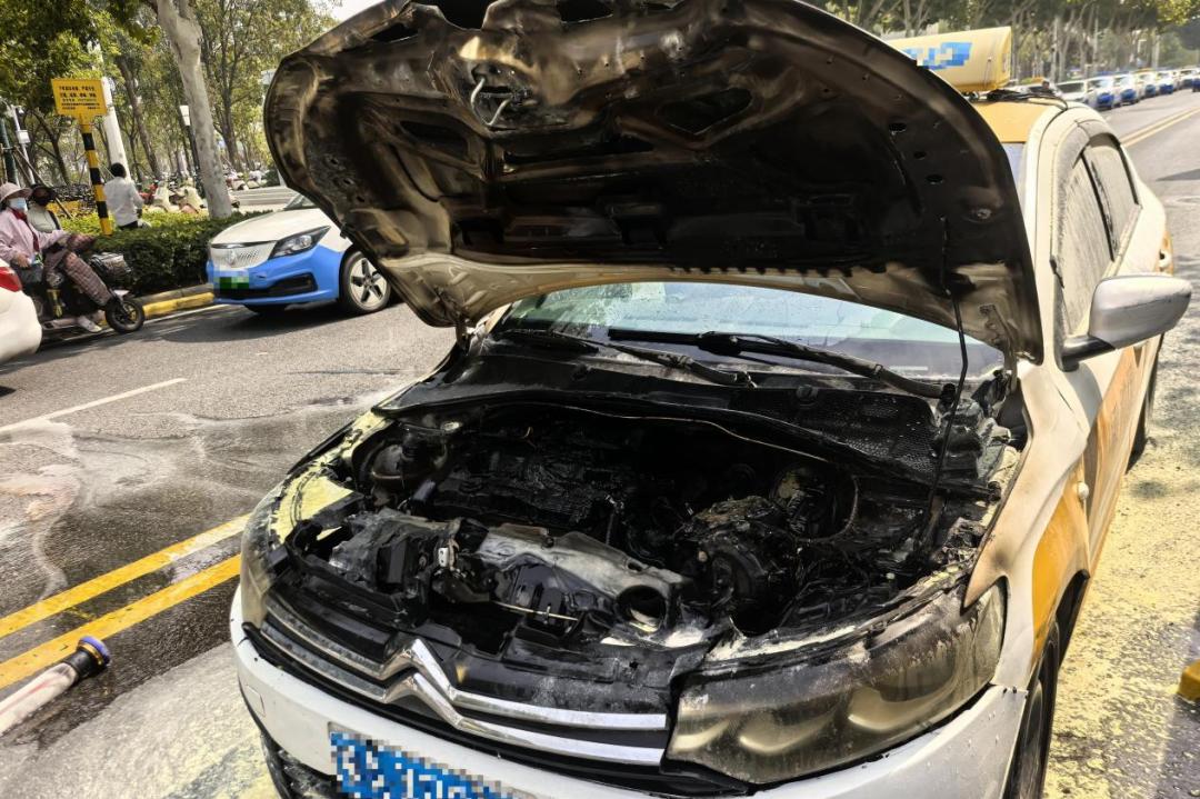 出租车行驶途中自燃,引擎盖烧得黢黑!