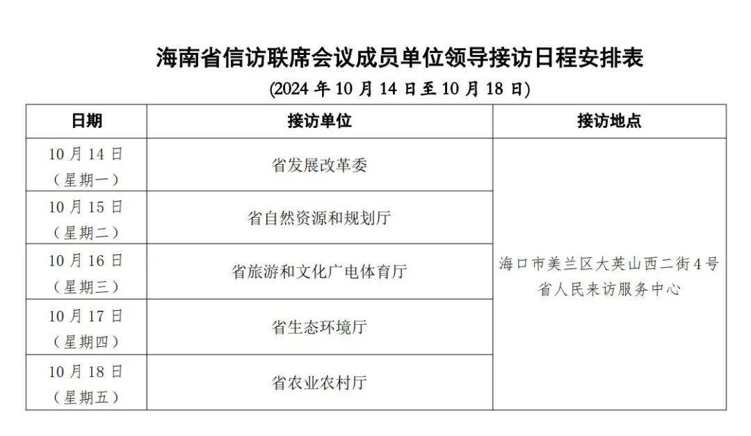 10月14日至10月18日海南省直属单位领导接访日程公布。详情(来源:南海网)