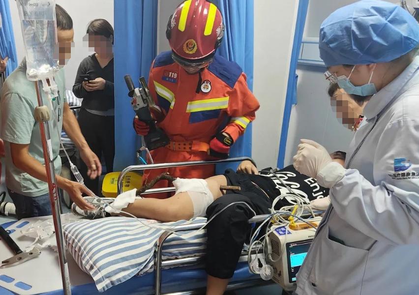 约2分钟后刺穿女孩腿部的树枝被安全截断