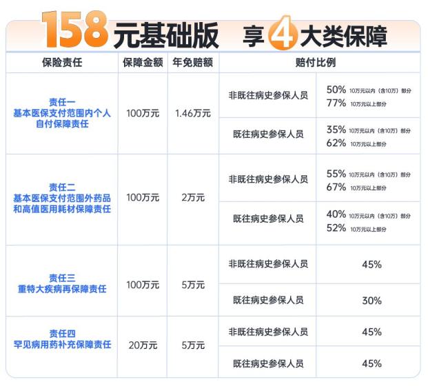 “基础版”保费仍然维持往年的158元/年,坚持四重保障,充分发挥补充保障和梯次减负效应。