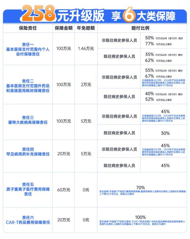 “升级版”的价格为258元/年,在“基础版”四项保障责任的基础上,增加两项前沿医疗保障,更好地满足不同群众多元化医疗保障需求。