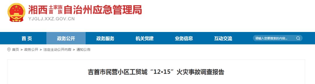 经调查认定,吉首市民营小区工贸城“12·15”火灾过火面积1.8万平米,直接经济损失923.6万元(不包括商户损失),是一起有较大社会影响的火灾事故。
