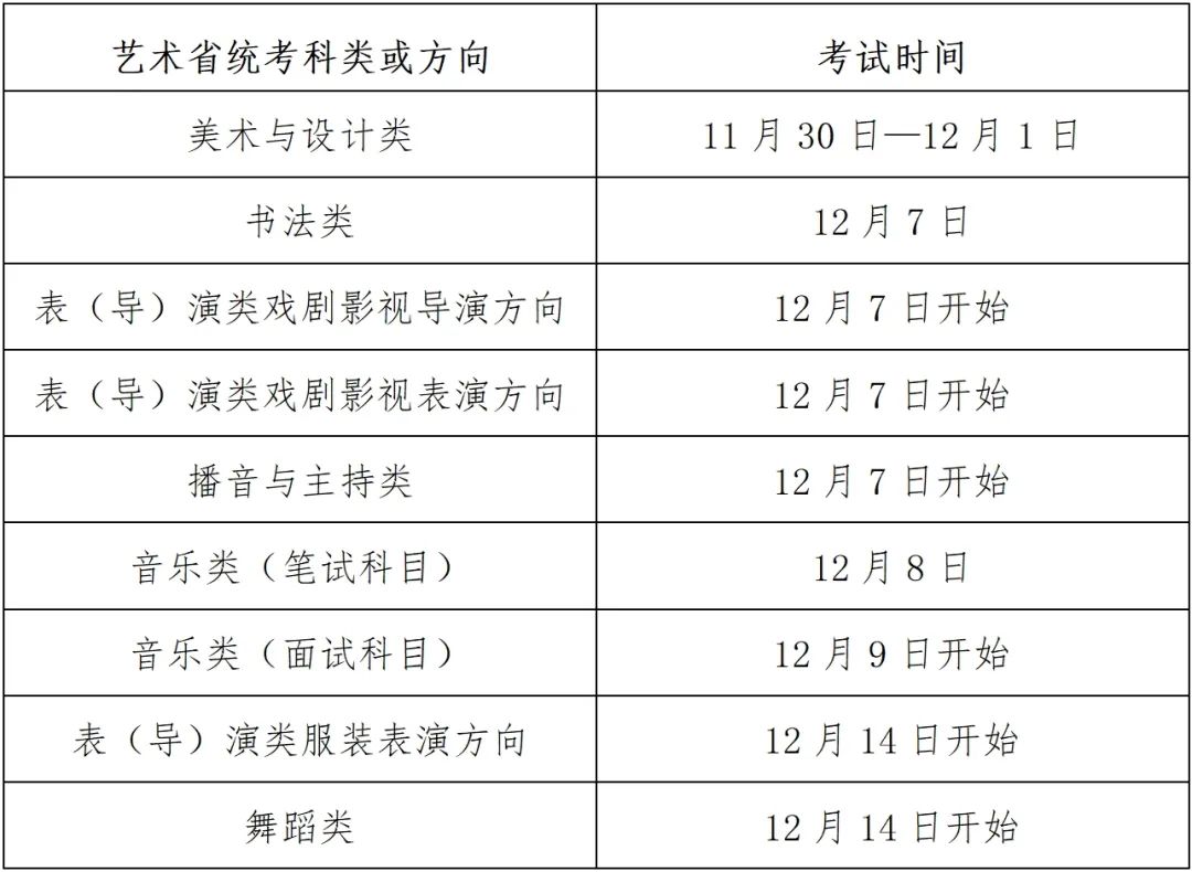 美术与设计类省统考考生在高考报名地所属的设区市参加专业考试。音乐、舞蹈、表(导)演、播音与主持、书法等5类省统考,专业考试在指定考点集中进行。各科类省统考时间安排如下: