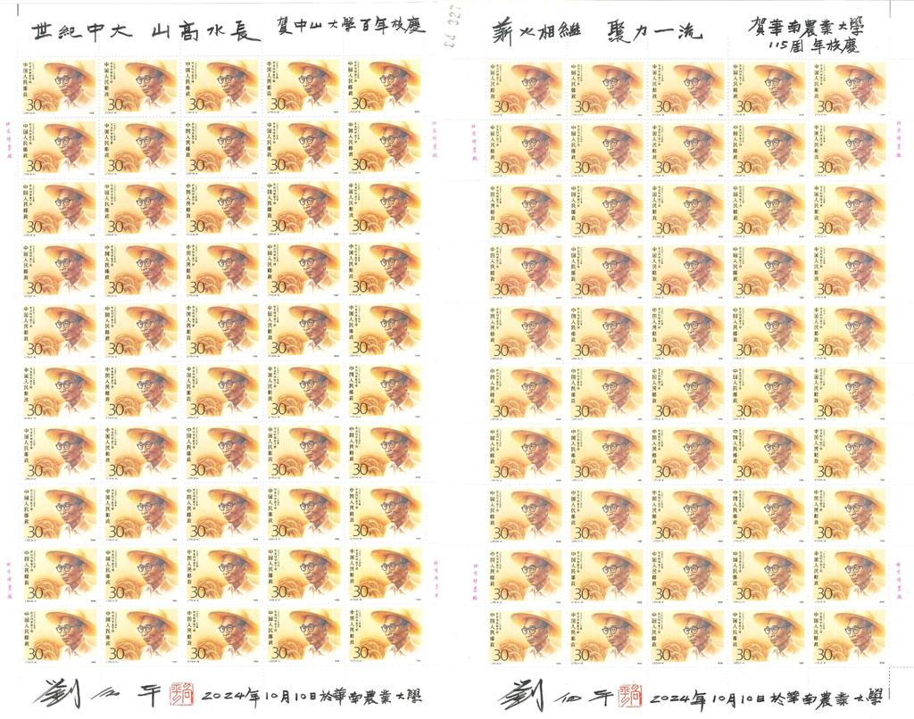 丁颖邮票肖像创作者、著名画家刘向平先生为两校校庆题字祝福今年,是孙中山创办中山大学100周年