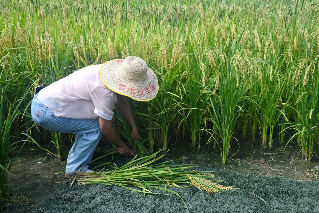 工作人员现场演示收割节水抗旱稻