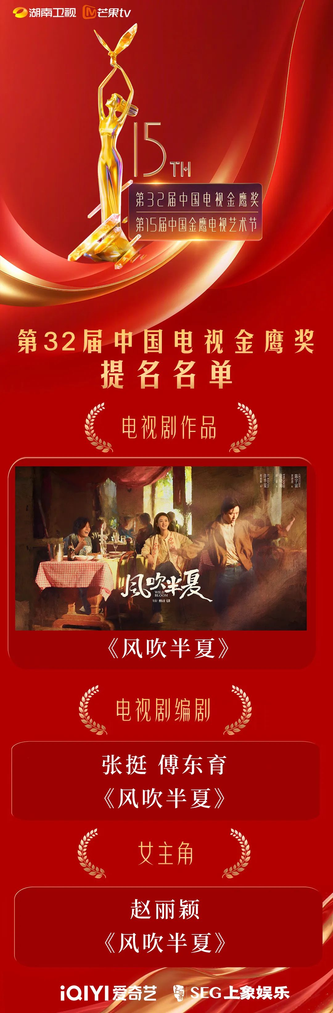 河北籍演员赵丽颖凭借在《风吹半夏》中的精彩表演,获提名最佳女主角。同时,她主演的两部电视剧《风吹半夏》和《幸福到万家》,均提名第32届金鹰奖“优秀电视剧”。