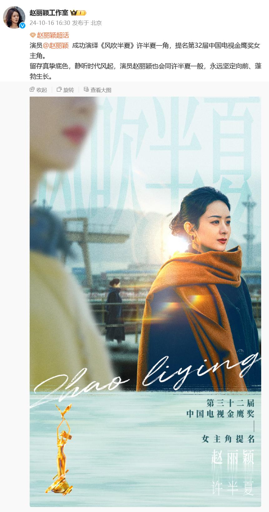 巧合的是,今天正是赵丽颖37岁生日,生日当天凭借《风吹半夏》提名金鹰奖视后,可谓惊喜连连。名单公布后,赵丽颖工作室发文回应:“演员赵丽颖成功演绎《风吹半夏》许半夏一角,提名第32届中国电视金鹰奖女主角。留存真挚底色,静听时代风起,演员赵丽颖也会同许半夏一般,永远坚定向前、蓬勃生长。”