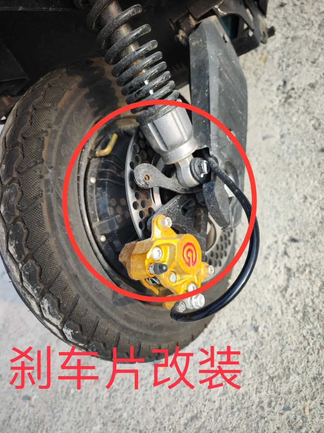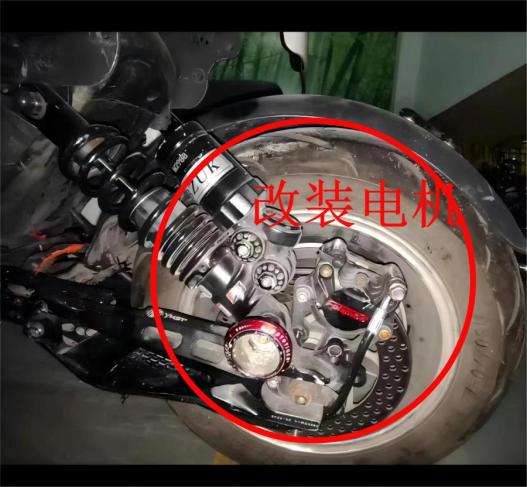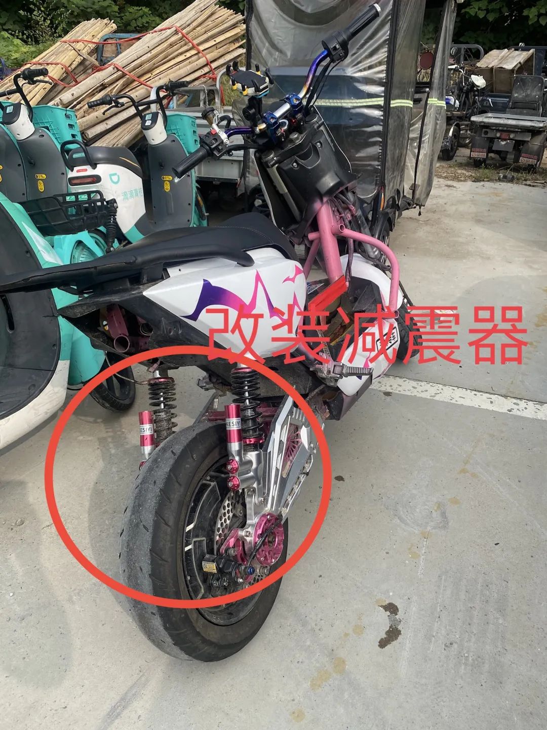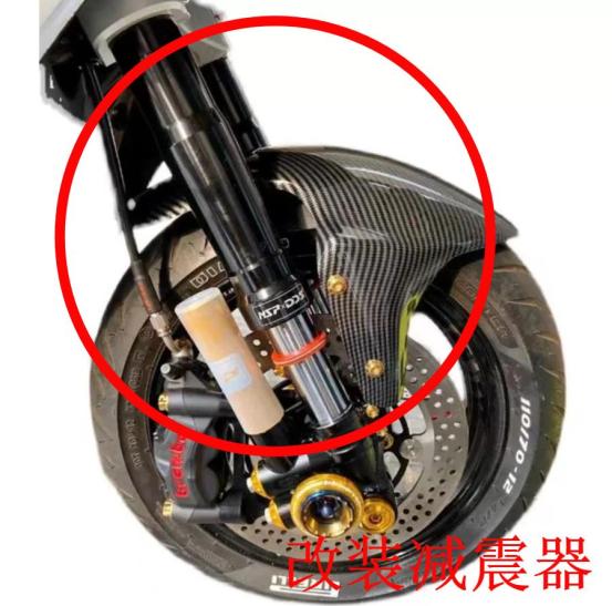 改装后的电动车减震器一般颜色鲜艳,而且悬挂高度较高。03