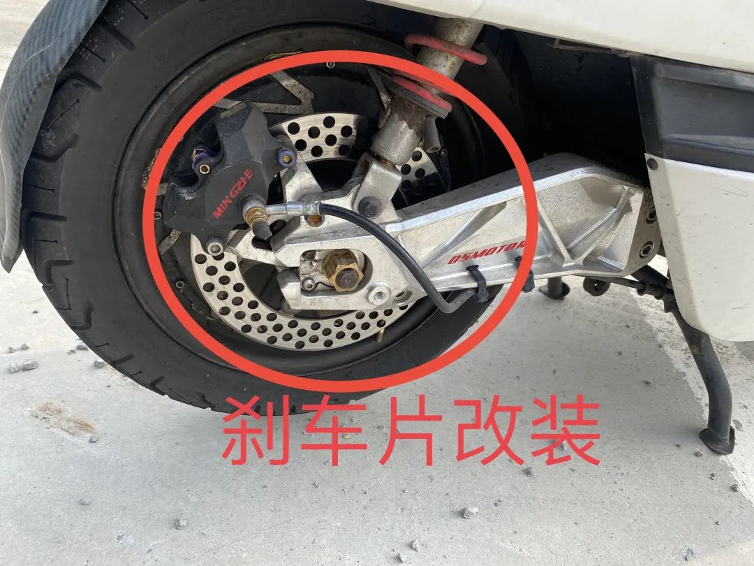 改装后的刹车盘尺寸更大,刹车卡钳颜色鲜艳,制动液管线一般较粗且外露。04