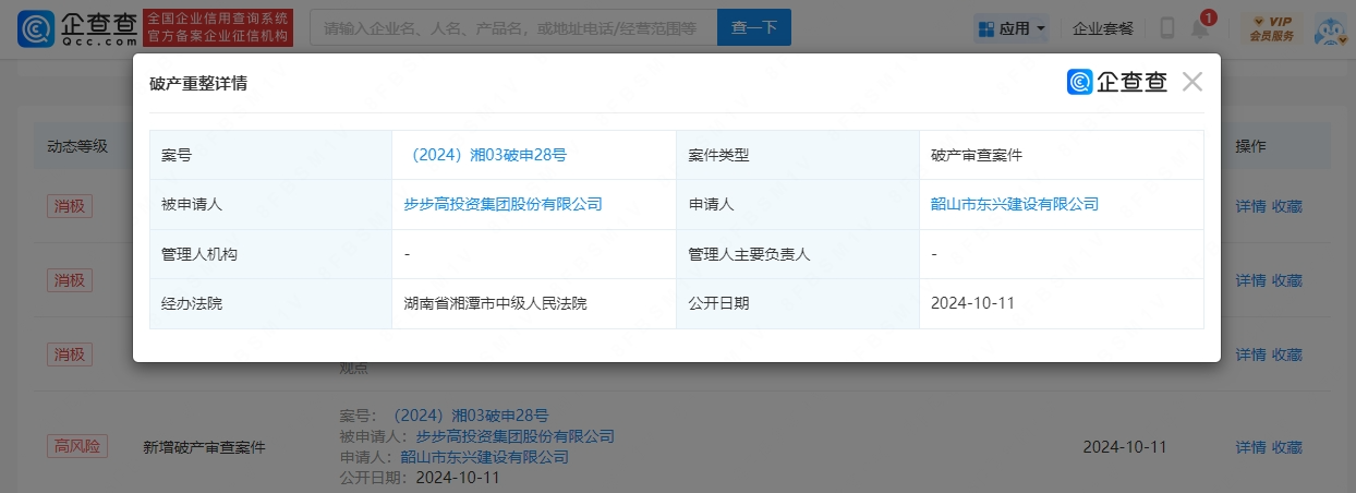 10月11日,企查查信息显示,步步高股份的母公司步步高投资集团股份有限公司(以下简称步步高投资集团)新增一则破产审查案件。申请人韶山市东兴建设有限公司以步步高集团“不能清偿到期债务且明显缺乏清偿能力”为由,向湘潭中院申请对步步高投资集团进行破产审查。