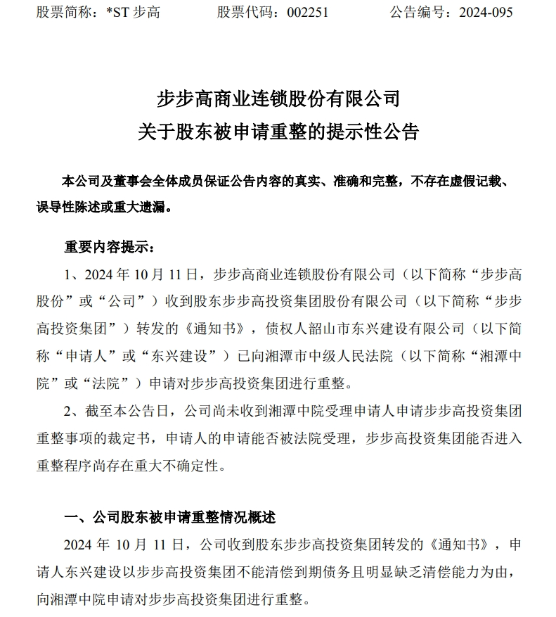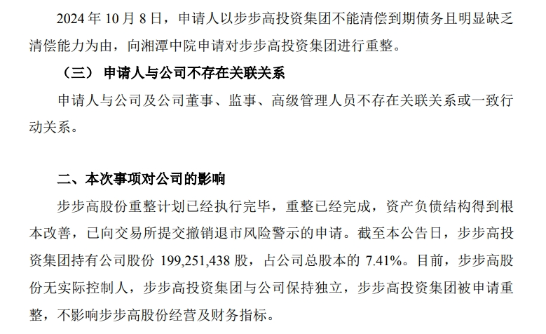 公告显示,目前,步步高股份无实际控制人,步步高投资集团与公司保持独立,步步高投资集团被申请重整,不影响步步高股份经营及财务指标。