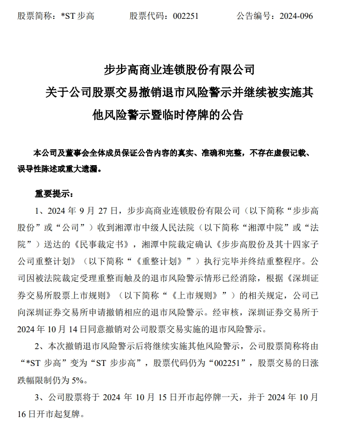10月16日,步步高商业连锁股份有限公司(以下简称步步高股份)复牌,这标志着步步高股份成功撤销了退市风险警示。
