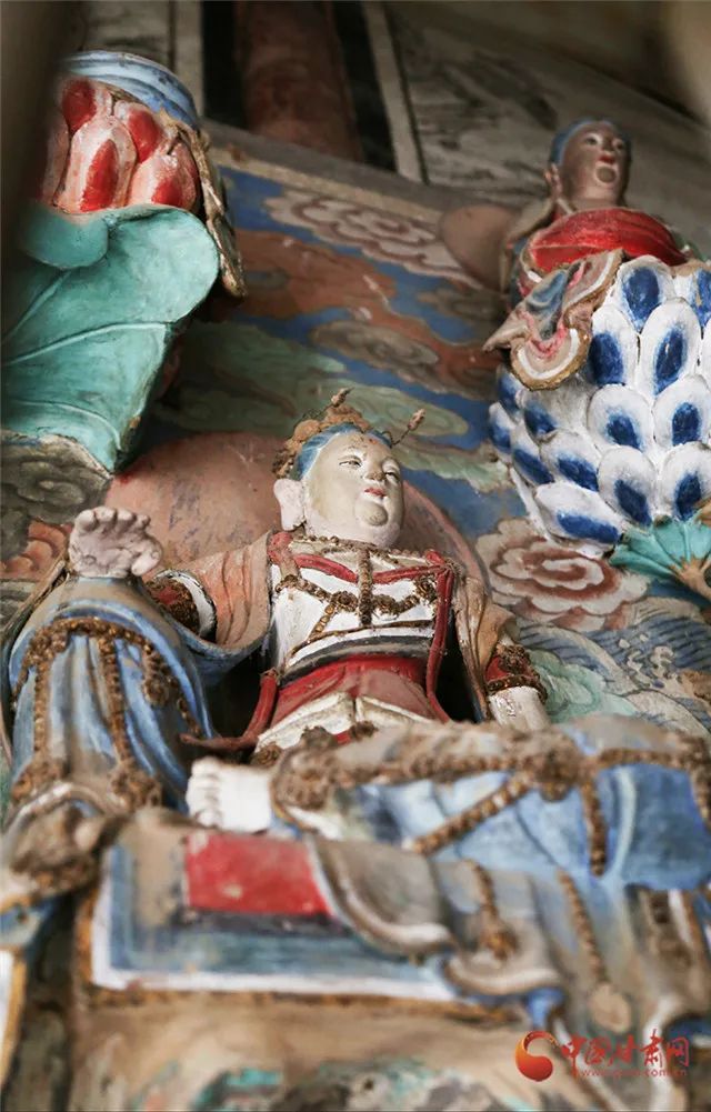 在南崖,采访团见到了这尊“释迦会子”佛像,佛高约3米,低平肉髻,长圆脸,弧眉凤目,两眼下视,悬鼻小口,面颊饱满圆润,胸以下部分残毁,脚下为三重仰莲瓣式莲台,莲台下塑一朵祥云。弟子高约1.5米,体态微右侧而立,头戴圆筒冠,面形饱满,弯眉细目,眼角带有笑意,双眼平视前方,鼻直口小,短颈端肩,挺胸鼓腹,穿圆领长袍,腰系玉带,双手前伸,合握胸前,踩在圆莲台上……