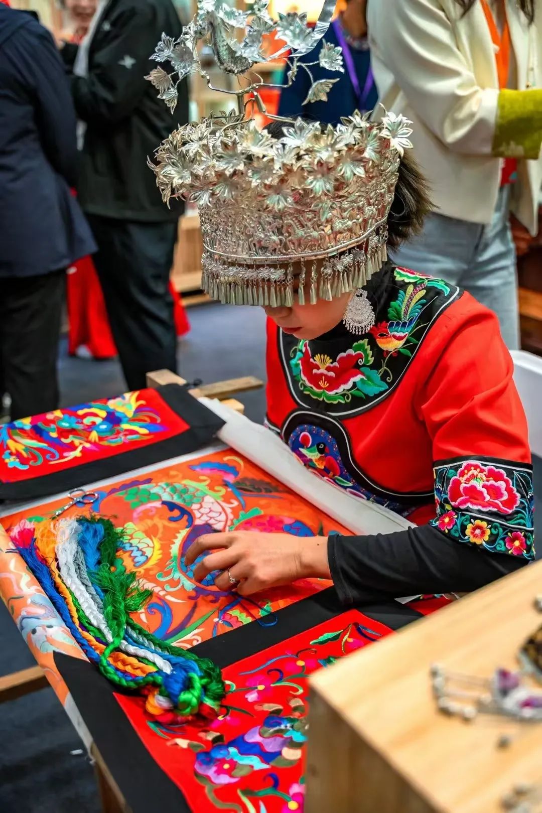 走进锦绣华裳展区,如同走进一个时空隧道,瞬间穿越到千年前的东方美学殿堂!无锡精微绣、杭罗织造技艺、侗锦织造技艺、枫香印染技艺、龙凤旗袍手工制作技艺……东方美学的含蓄与灵动,在这里展现得淋漓尽致。