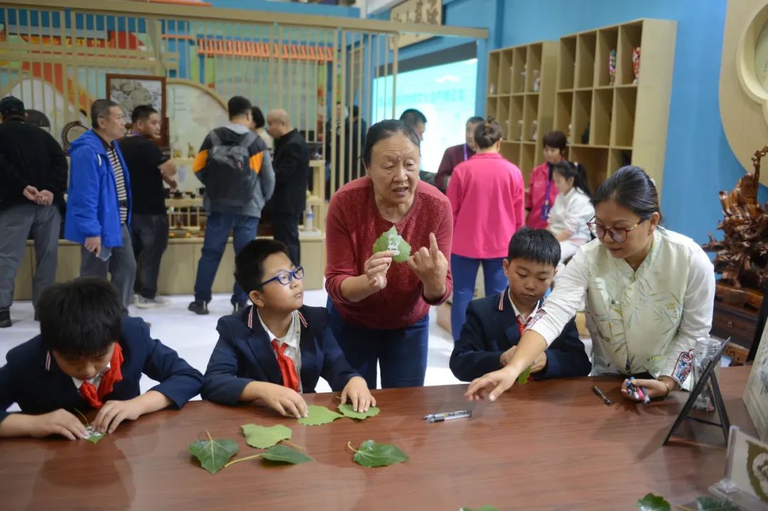 现场进行研学教学的是我们的济南叶雕、剪纸两个项目的传承人都老师,她不仅在社区、学校开课,还收了五六十个徒弟,最小的才6岁哦!看看这些小手,是不是也想试试剪纸的乐趣呢?