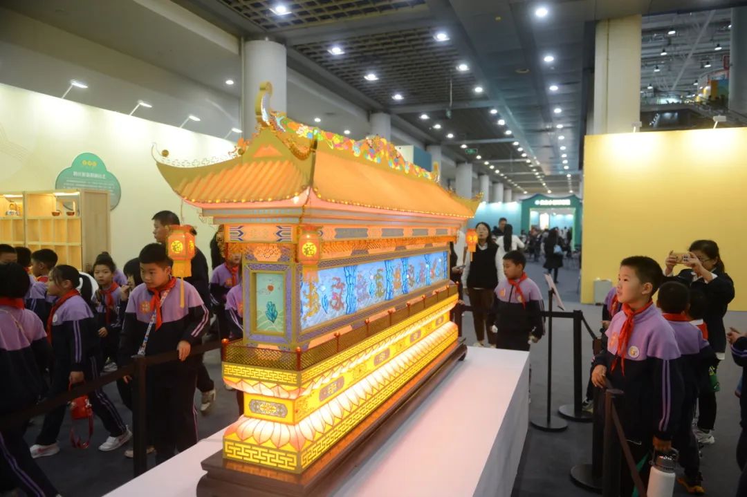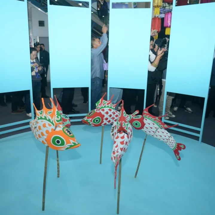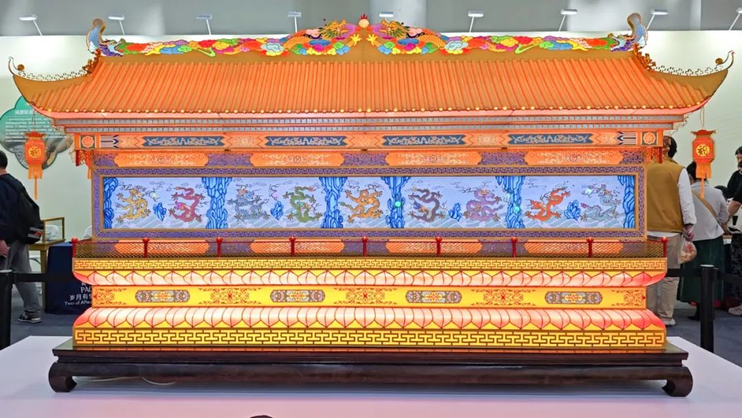 最后,压轴大戏来啦!中岛上的巨大展品——硖石灯彩·九龙壁,绝对是全场焦点!这项国家级非遗项目,以其精湛的工艺和震撼的视觉效果,让人叹为观止。
