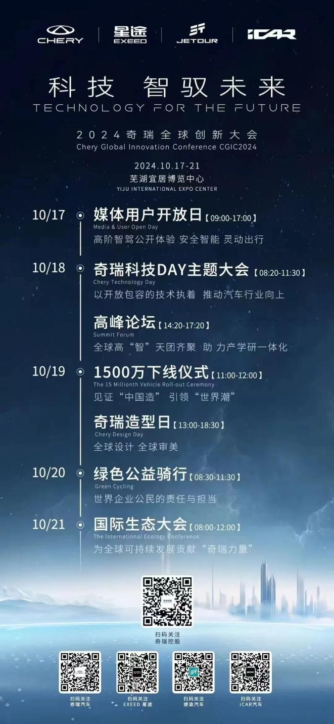 奇瑞将于10月17日至19日在宜居国际博览中心举办以“科技智驭未来”为主题的全球创新大会,通过2024科技 DAY、院士高峰论坛、1500万辆下线仪式等系列活动,集中展示奇瑞及行业内最新科研成果、创新产品与技术解决方案。