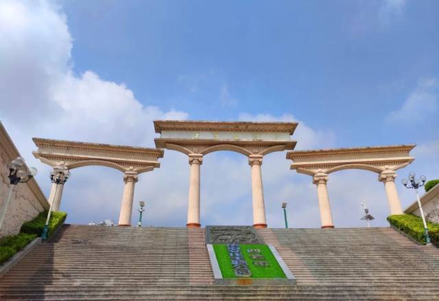 四会的江滨堤园坐落在绥江河畔,牌坊为四柱三门,气度恢宏。