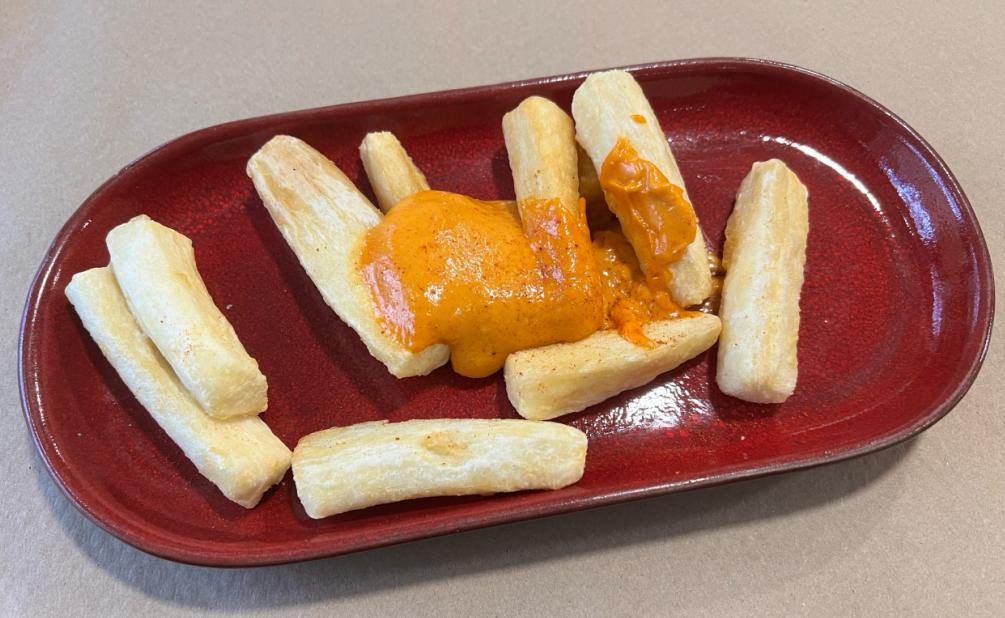 右上角是用红豆做的黑豆饭另一个在西班牙能找到的尼加拉瓜特色菜是Vigorón,它是木薯、腌菜和炸猪皮的组合。木薯被煮熟后切片,搭配腌制的蔬菜,最后加入脆脆的炸猪皮,每一口都将淳朴的乡土风味相融合。其中既有木薯的柔软,也有炸猪皮的酥脆,果腹或许稍显简陋,拿来下酒倒是别有一番滋味。