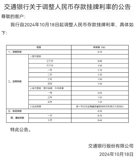 中国工商银行、中国农业银行、中国银行、中国建设银行、交通银行、中国邮政储蓄银行等多家银行发布公告,从今天(10月18日)起,下调人民币存款挂牌利率。