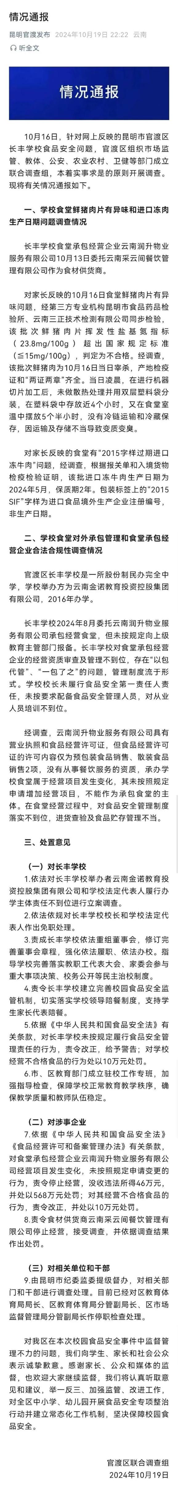 针对网上反映的昆明市官渡区长丰学校食品安全问题,官渡区成立联合调查组开展调查。10月19日夜间22时22分,官渡区联合调查组通报了有关情况。