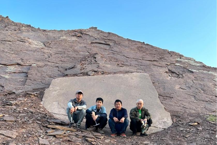 野外团队在新疆柯坪克尔买提地区塔塔埃尔塔格组中发现大片波痕构造,指示了该片地区在 4.38 亿年前曾是一片浅海环境。左起山显任、林翔鸿、盖志琨、赵日东。