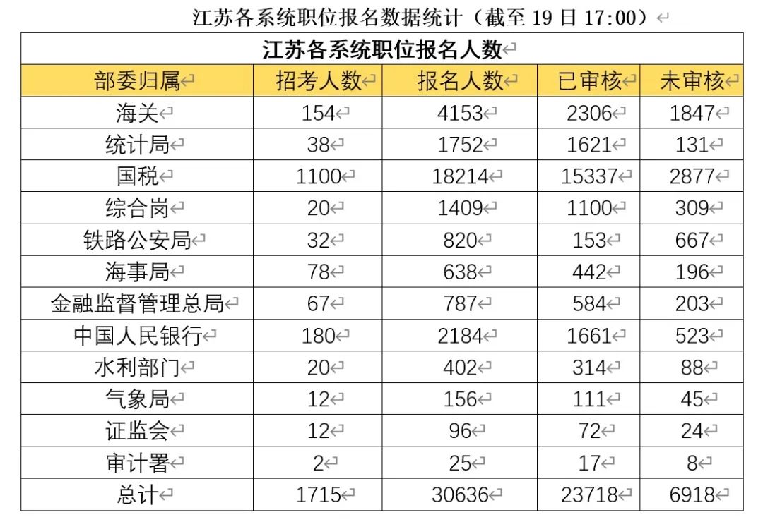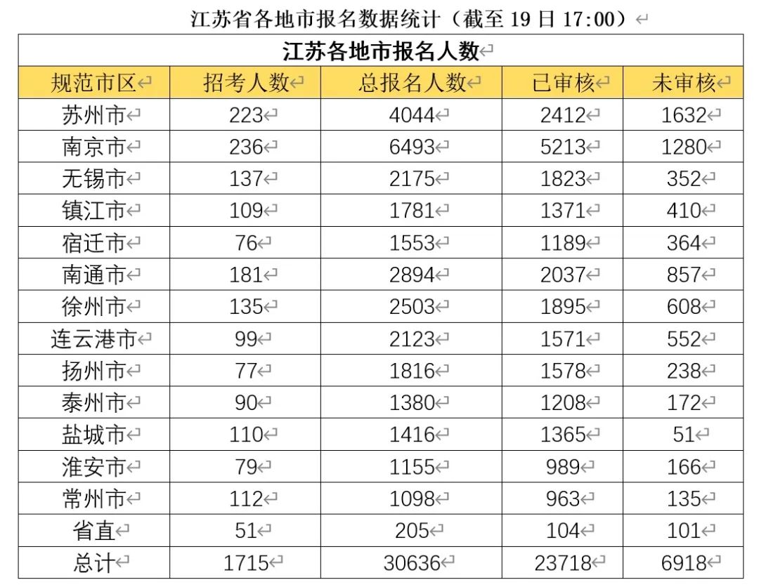 截至10月20日10:00,国考报名涉苏岗位的已有35172人,其中已有一般人已经通过资格审查,确认拿到2025国考“入场券”。从岗位热度来看,国税因为总体招录人数较多,报名人数依旧遥遥领先,截至19日17:00,总报名人数近1.8万,整体竞争比超过了16.5∶1。目前最热门岗位是国家统计局江苏调查总队的“江苏调查总队财务管理处一级科员”一职,竞争比达到763∶1。随着后面几天报名人数的增加,竞争强度必将进一步提高。目前还有16个职位无人提交报名申请,占总职位数的4.5%,这些岗位大多集中在海事系统,这与报考条件限制较多有关。