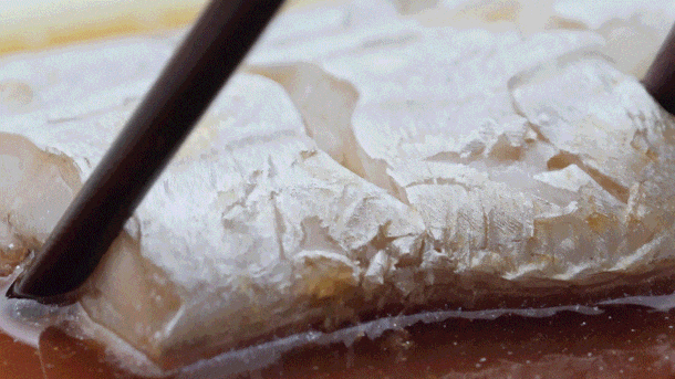 开到好的带鱼盲盒,那就是上好的美事了。相比于冬日鱼摊上的其他鱼,带鱼刺少好吃又常见,我从小爱吃带鱼的味蕾,也是多亏得这些带鱼。带鱼身型简单干净,比起其他鱼我也更爱收拾带鱼。找个“吉日良辰”,也就是有太阳的正午,把冻带鱼放进冷水盆,待盆面结出一层薄冰,这是化冻的信号。鱼上的冰从水中吸热,水也释放了一定的热量融化冰,从而使盆中水到达凝结点而结冰。