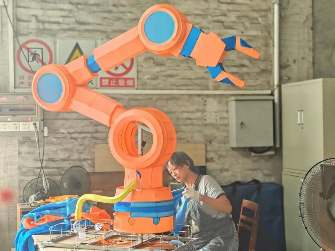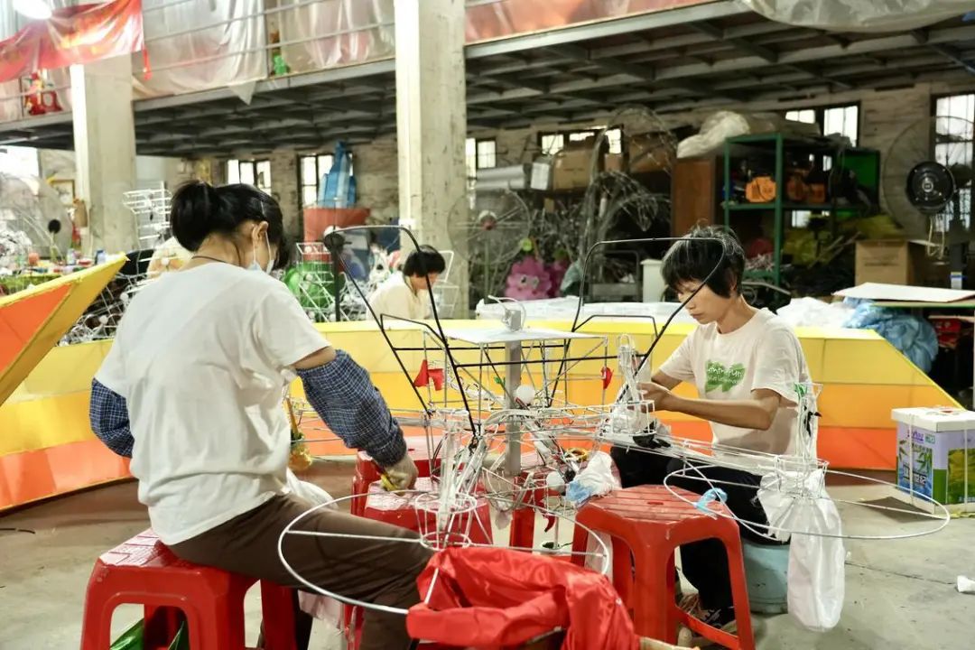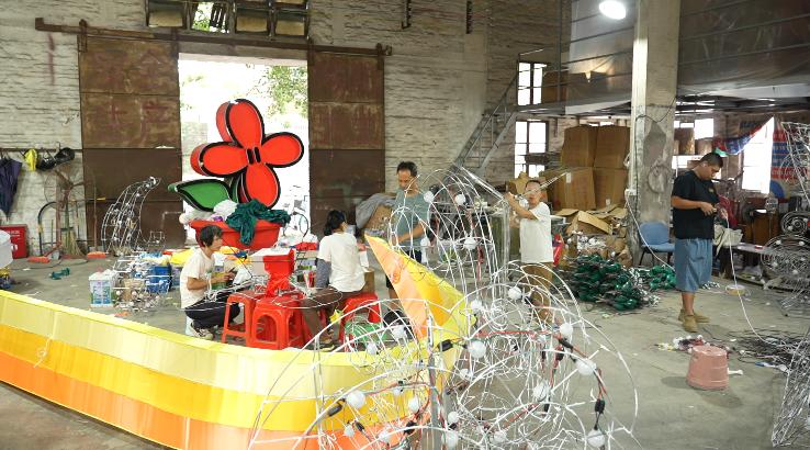 这是彩车的最后一道工序。师傅将做好的部件按顺序组装,并对组装件进行绑定和焊接,要求安装牢固。全部部件安装好后,最后在彩车四周贴上裙边。